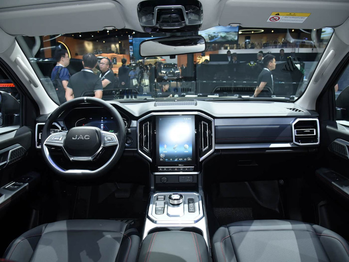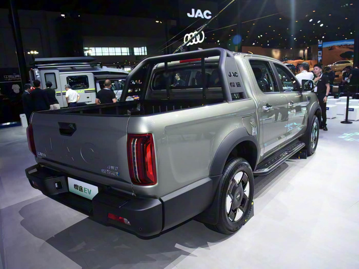 再来看车尾部分,车尾采用一字型矩阵LED尾灯,夜间点亮效果醒目,提升行车安全性。 嵌入式“JAC”标识与银色分体式贯穿龙门架形成视觉焦点,既优化风阻又强化品牌辨识度。货箱尾门开口宽阔,便于装卸货物,而原厂货箱宝设计则有效防止刮擦腐蚀。整体造型方正硬朗,与前脸设计形成呼应,凸显皮卡的功能本质。