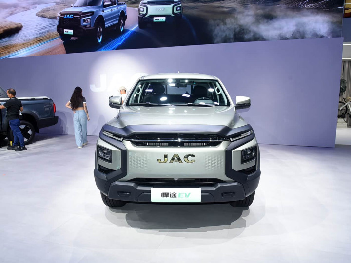 我们首先来看新车的外观设计方面,悍途新能源采用封闭式前脸设计,搭配LED分体式大灯和猎手天眼厚壁流水转向灯,营造出强烈的未来科技感。 前脸线条平直硬朗,融入中国鼎设计美学元素,既保留美式皮卡的粗犷气质,又通过简约轮廓展现国潮风范。 自动头灯功能提升夜间行车安全性,而隐藏式进气格栅设计则强化了电动车的身份标识。整体造型在停驻时极具辨识度,行驶中更显动感凌厉。