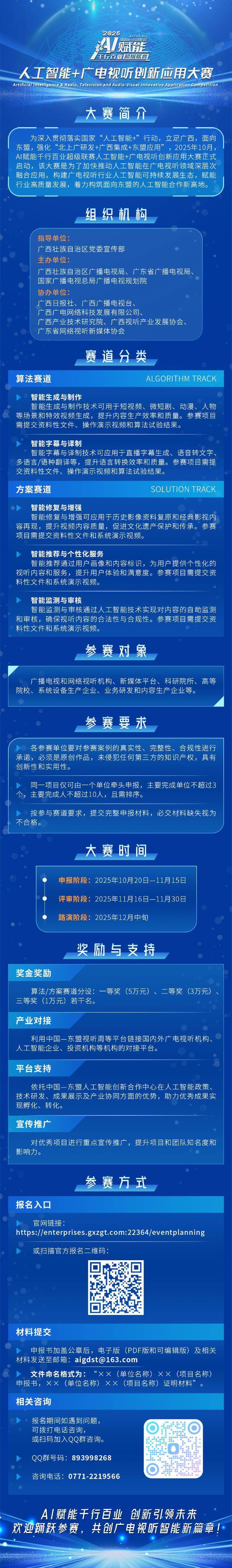 大赛自10月20日启动,报名截止时间为11月15日,12月中旬赛事结束,分为申报、评审、路演三个阶段。为促进优秀项目实现落地转化和产业合作,大赛不仅提供奖金激励,还将充分利用中国—东盟视听周、“东盟伙伴”媒体合作周等平台,搭建参赛项目与国内外广电视听机构、人工智能企业、投资机构等机构的对接平台;并依托中国—东盟人工智能创新合作中心在人工智能政策、技术研发、成果展示及产业协同等多方面的支持,助力项目孵化与推广应用。